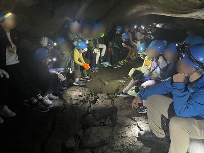 15:00 洞窟内は外の気温と違い、冷んやりしていました。全員のライトを一斉に消すとそこは真っ暗な世界でした。洞窟の中は所々、狭いところがあり、大人の方が必死に這いつくばって脱出しました。インストラクターさんからは、溶岩が流れて樹海ができたことや樹海に住む動物について教えていただきました。