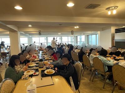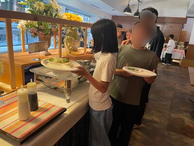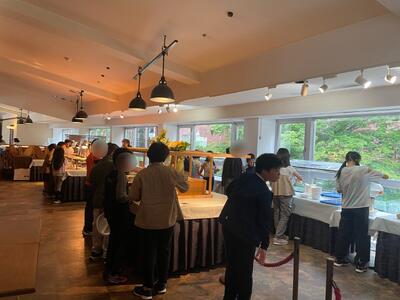 7:00 6時半に起床し、朝食タイム。昨日と同じようにバイキングです。サラダを取り皿に盛り、バランスよく食べようとしている子が多くいました。子供達の食べる様子を見ていると、ごはん派よりパン派が多いようです。5年生全員、今日も元気にスタートです。