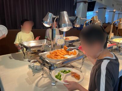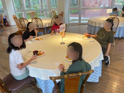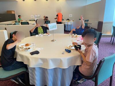 18:00 夕食タイム。サラダ、白身魚のフライ、照り焼きチキン、うどん、カレーライス、ゼリーなど子供達が好きなメニューがたくさん。何回もおかわりをしている子がたくさんいました。みんな、夕食を食べてパワーをチャージ!