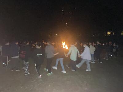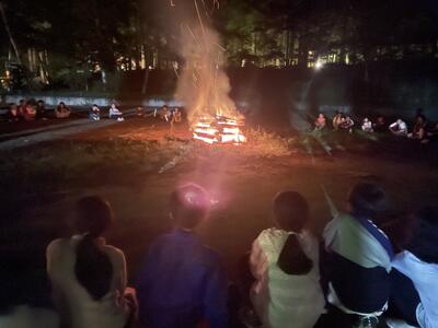 19:30 本日最後のイベントは、キャンプファイヤーです。火の神様から、永遠の火を分けてもらいました。1組は「自信の火」2組は「協力の火」たんぽぽ学級は「元気の火」4くみは「集中の火」この火を大切に、5年生全員で成長していきましょう。
