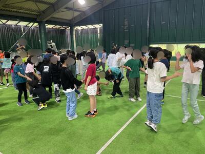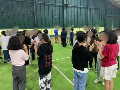 9:10 チームビルディング(協力ゲーム)です。息を合わせてタッチするゲームや血液型に分かれたり、声を出さずに誕生月に分かれたりしました。このゲームを通して、心が通じ合った時の気持ちよさや楽しさを味わうことができました。