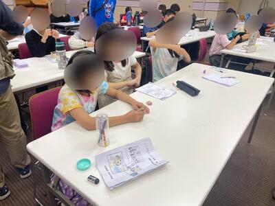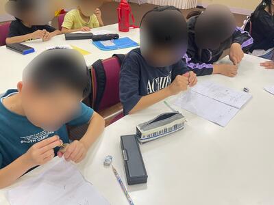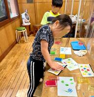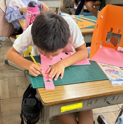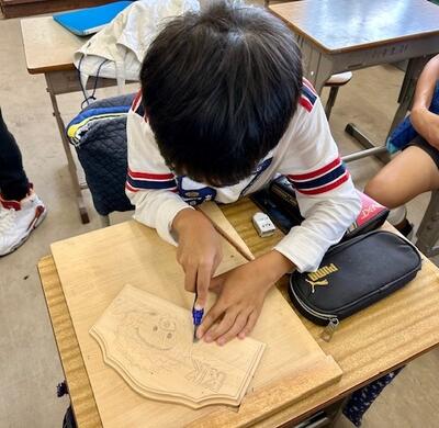 6年生は教室で、消しゴムハンコを作成中です。篆刻(てんこく)とも言いますが、色紙に思い思いの文字を描いた作品に朱を使った押印をすると違った味わいになります。デザインカッターだと削りやすいのですが、普通のカッターだと刃先がうまく動いてくれなくて苦戦中。