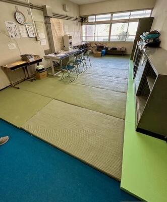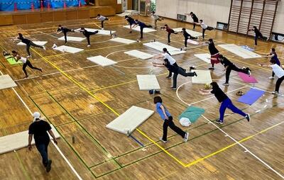 放課後、体育館に職員が集まって、インストラクターの指導の下、フィットネス中!忙しさもあって疲れがMAXかもしれません。1学期がもうすぐ終わるこの時期だからこそリラックス&リフレッシュにより、心の安定を図ることも大事です。そしてまた明日、子供たちを笑顔で迎えたいと思います。ヨガマットではないのが…。