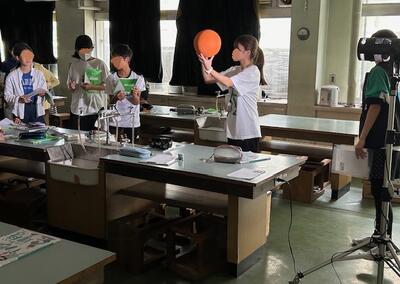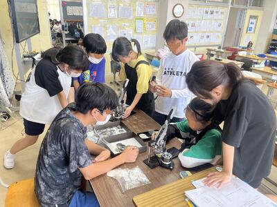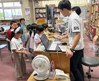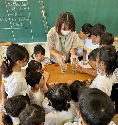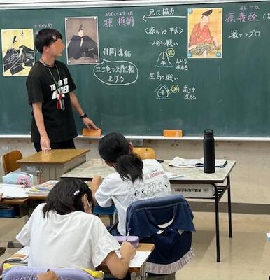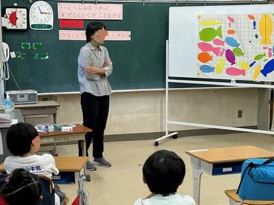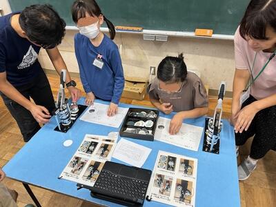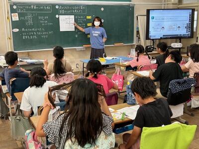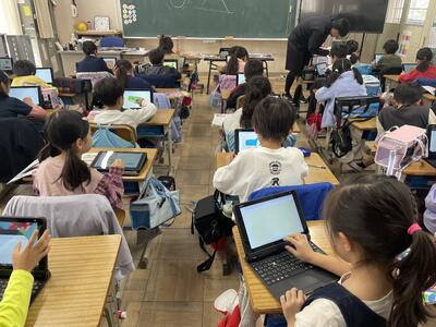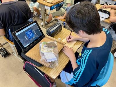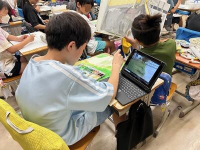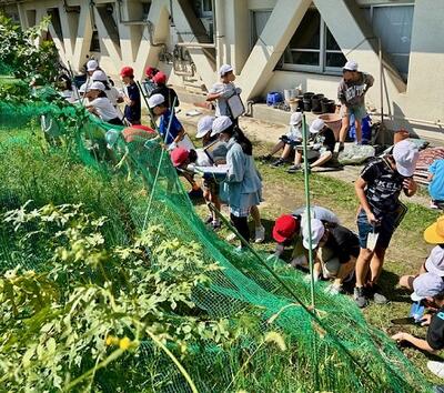 4年生が理科の学習で、「夏の終わりを見つけよう」とタブレット端末を持ち出して、植物や昆虫などを写して記録しています。授業が終わって教室へ戻るときには先生も被写体に…。私も「夏の終わり」ですかぁ?