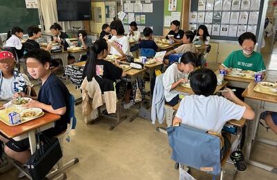 同じように、たんぽぽ学級の全員も交流学級で一緒に食べました。嬉しそうな表情が印象的です。