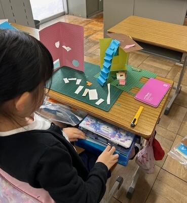 5年生は、机上の空間まで占有する工作物を置いて作業に没頭しています。ビー玉を転がすレールを自作しています。これって完成するまでどこに保管するのかなぁ?