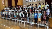 昨日の昼休み。乾燥して土埃が立つ校庭で、1年生と6年生が縄跳び交流をしていました。