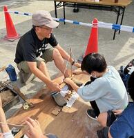 3年生は図工室でのこぎりを使って角材を切っています。外部指導者にのこぎりの使い方を教えてもらいながら、何度も試しています。