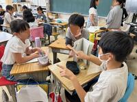 3年生の社会科の「昔のくらし」で洗濯体験?いえいえ、6年生の家庭科です。洗剤液を作って、たらいで靴下やタオルを手洗いして、干して乾かし、取り込みまでの一連の作業を学びます。