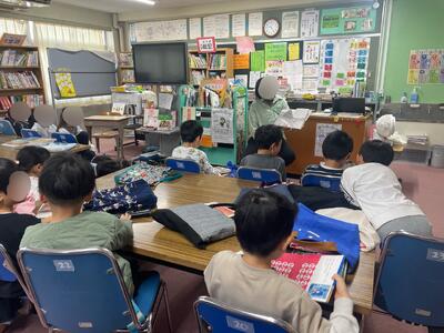 昨日と打って変わって寒い一日です。4年生の教室では、総合的な学習の時間で取り組む「福祉(障害のある人々)」の学年交流発表会に向けてリハーサルの真っ最中。室内をいくつかのコーナーを、発表者と聞き手に分かれて相互にアドバイスなどをしています。