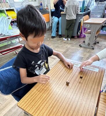さすがに1年生にベーゴマは難しい。若い先生曰く、「初めて見ました」だそうです。
