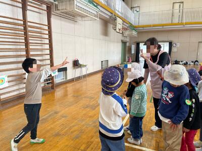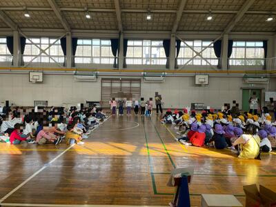 3時間目に、近隣5園の年長児を迎えて、5年生が学校探検(理科室や音楽室、図書室、1年生の教室などを巡る)と体育館レク(だるまさんがころんだ等)の2コースに分かれ、グループごとに活動をしました。来年度1年生で入学すると6年生としてペア学年を組みますので、今から仲よくなれることを願って…。