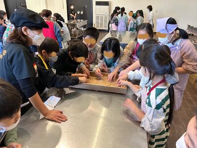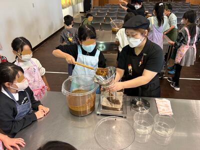 午前中、4年生は野田のキッコウマン醤油工場見学です。体験グループと見学グループに分かれて、約2時間。体験グループは、使用される大豆や小麦に触れ、もろみをかき混ぜて、最後に煎餅に刷毛で醤油を塗って焼いて食べました。