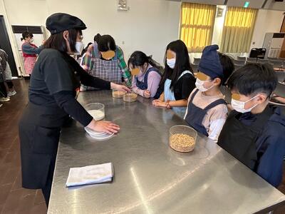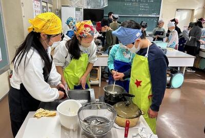 家庭科室では、5年生がごはんとみそ汁を作っています。煮干しで出汁をとり、大根や油揚げを具にしています。炊けたご飯は、家庭では味わえないおこげが混じっています。いいなぁ。