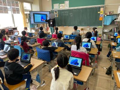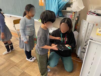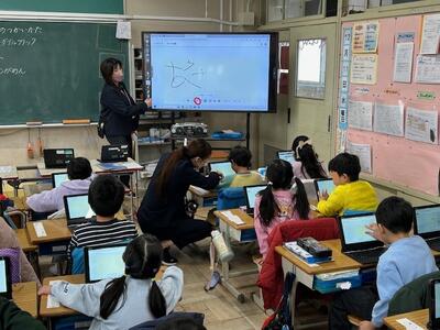1年生にもタブレットが配付されたのは先日のこと。各クラスでは、すき間時間を使って子供たちが触れられるようにしてきました。今日は、教育センター職員と学生ボランティアの指導・支援の下、新しいことにも挑戦しました。