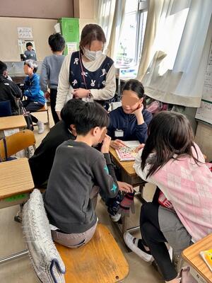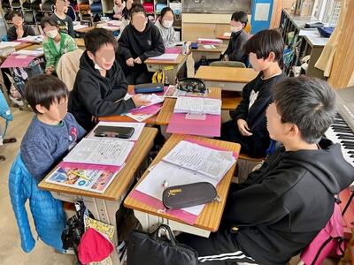 昨日と打って変わって寒い一日です。4年生の教室では、総合的な学習の時間で取り組む「福祉(障害のある人々)」の学年交流発表会に向けてリハーサルの真っ最中。室内をいくつかのコーナーを、発表者と聞き手に分かれて相互にアドバイスなどをしています。
