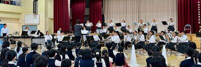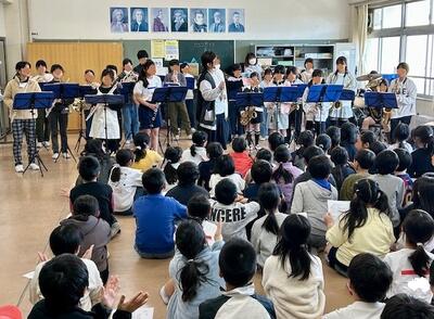 第八中学校体育館を会場に、地区別音楽会が開催されました。会場の第八中学校をはじめ、鶴指小、大和田小、平田小の4校の吹奏楽部が日ごろの練習の成果を披露しあったのです。素敵な音が響き渡りました。写真は、平田小と第八中の演奏の様子。