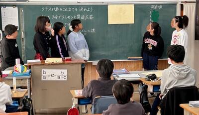 6年生のある学級では、「クラス代表献立を決めよう」というテーマで、6グループがそれぞれ栄養バランスを考え、こだわりを持ったメニューを3分間でプレゼンしていました。栄養士も一緒に聞きながら、質疑にも加わっています。全部の発表が終了したのち、良いと思う献立に一人2票投じて、学級の代表を決めるようです。3クラスそれぞれの代表献立は、3学期のメニューに反映されます。(12/3に関連記事)