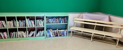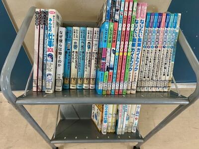 高学年の廊下には、学習に活用される図書が置かれています。5年生は、国語で『雪わたり』(宮沢賢治)を学習するので、同じ作者の本を公共図書館からも借りて並んでいます。6年生はキャリア教育を始めるにあたって、関連する本を集めたようです。高学年のまるごと図書館スペースには、長椅子が運ばれてきて、座って読めるようになりました。
