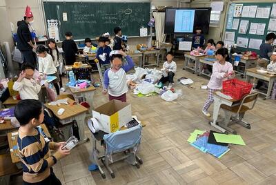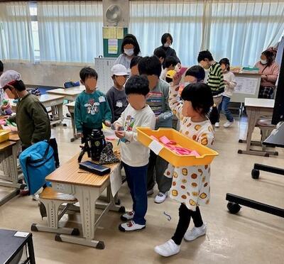 2年生は教室と廊下を使って、学年全員で「おもちゃランド」を楽しんでいます。自分たちで作った遊び道具を置いたお店と客を交代しながら、様々なブースを回って、手作りの景品までもらっています。