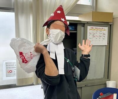 1年生の教室では、図工で変身キットを自作していました。とても楽しそうで、サンタクロースも手伝っています。