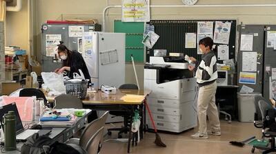 冬季休業の始まりの日。職員室のコピー機の裏や冷蔵庫の中などをきれいに掃除したり不要なものを処分したり…。子供たちの声がない中で、ゆったりとした時間が流れています。