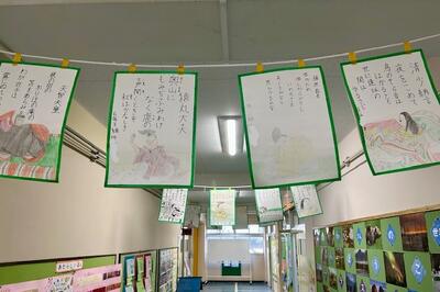 図書室前の廊下には、手作りの百人一首の札が上からぶら下がっています。各教室でも取り組む姿が多く見られるようになっています。