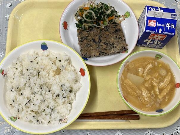 わかめごはん、和風ミート、辛し和え、味噌汁、牛乳