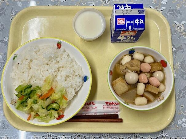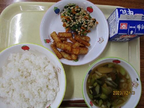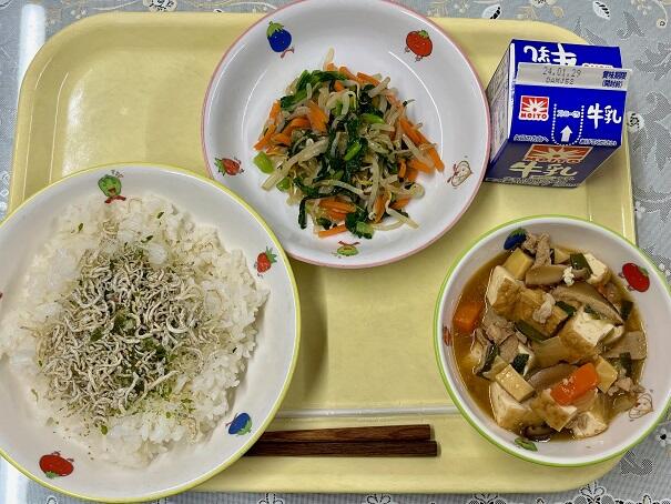 今年度の給食最終日が迫ってきました。今日を含めて6回ですから、感謝して食べたいと思います。ジューシーな感じのおかか和えはご飯と合います。千草焼きは、いつも以上にチーズの風味が感じられます。素朴な汁物は、今日みたいな寒い日に嬉しい一品です。