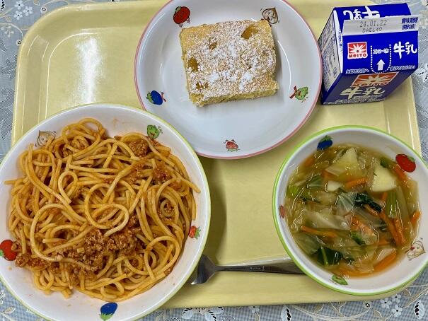 スパゲッティボロネーゼ、キャベツスープ、パイナップルケーキ、牛乳