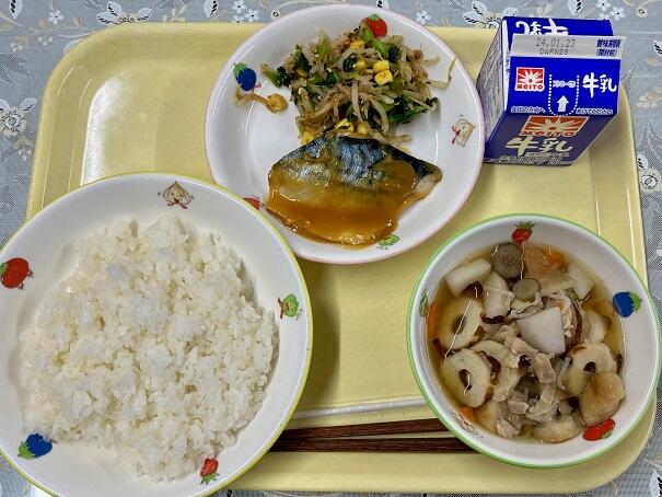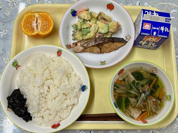 さつまいもご飯、鯖の文化干し焼き、おかか辛子和え、豚汁、牛乳