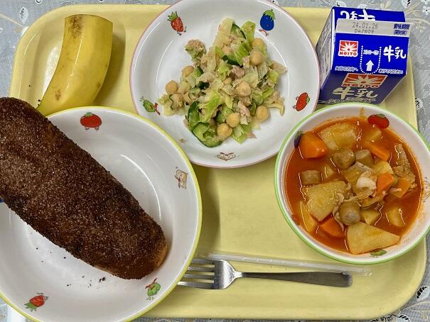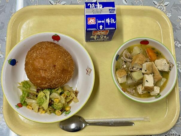 いままで給食で初めてのカレーパン!!どんなものかとワクワクしていましたが、見た目はコロンと真ん丸で存在感たっぷりです。オーブンで焼き上げているのでパン生地は油っぽくなくカリカリ、中の具はひき肉と野菜のうまみから手作りの良さを実感します。洋風煮込みはやはり豆腐より厚揚げの方が味が出ていい感じです。