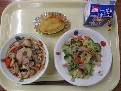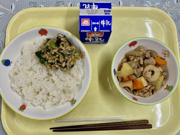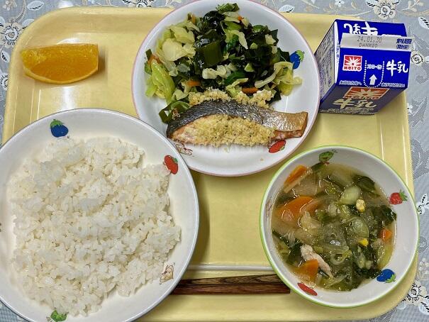 さんが焼きは驚くほどのふわふわ食感で、ねぎ・ショウガ・しそ等の薬味が効いています。きっとタネに具材を入れた後にしっかりと混ぜ合わせたのでしょう。澄まし汁も豆腐が大きめで食べ応え十分でした。ここ2日間、修学旅行引率組の先生方の分は給食がありません…恨めしそうに眺める先生方を横目においしくいただきました。