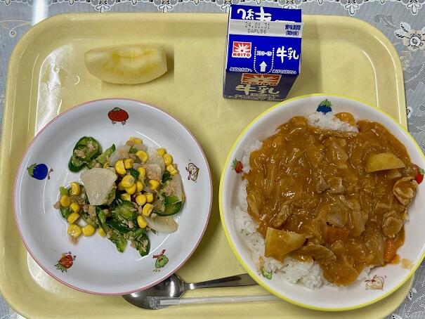 6年生が、小学校のカレーライスを食べるのは今日が最後。コクがあって少し甘みも感じられておいしいです。マリネは、ひじき・きゅうり・ハムの相性がよいことを感じます。デザートは、透明ゼリーと黄身に見立てた杏です。
