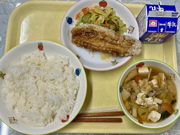 ごはん、鱈のみそ焼き、ひじポテサラダ、けんちん汁、牛乳