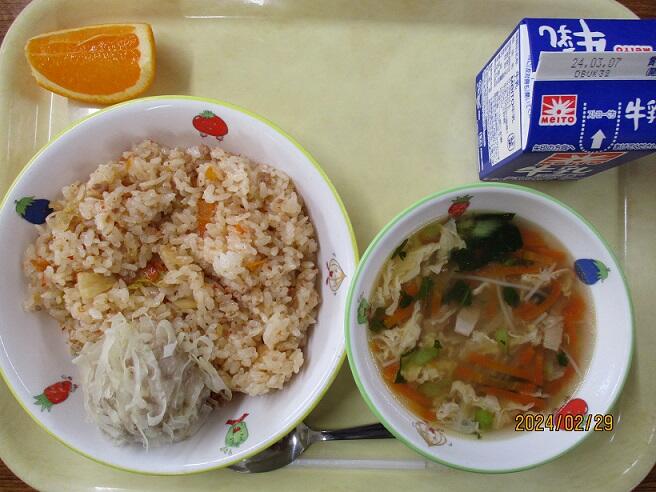 キムチご飯、揚げ餃子、中華風コーンスープ、せとか、牛乳