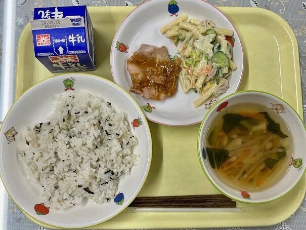 ワカメごはん、鶏肉のごまだれかけ、マカロニサラダ、すまし汁、牛乳