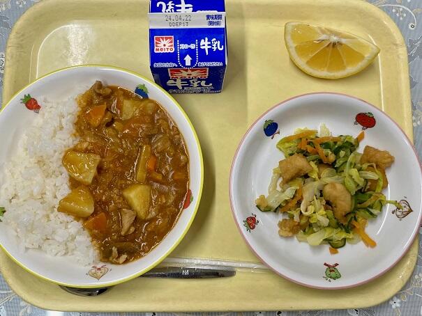 サラダは、しっとりした野菜の味付けを抑えて鶏肉の香ばしさを大事にしています。ハヤシライスは、ゴロゴロしたジャガイモがほんのり甘めのルーと一緒になることで存在感を高めているように感じます。1年生は今日から給食が始まります。