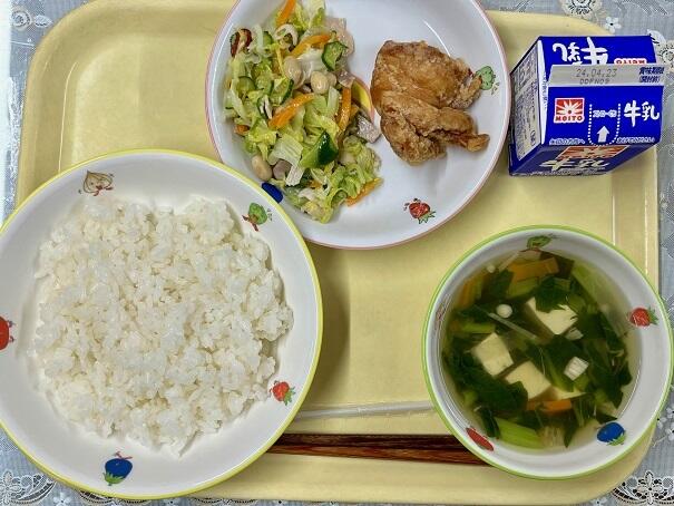 ごはん、鶏肉のから揚げ、すまし汁、大豆とハムのサラダ、牛乳