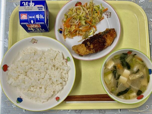 ごはん、鰺のフライ、だまこ汁、磯和え、りんご、牛乳