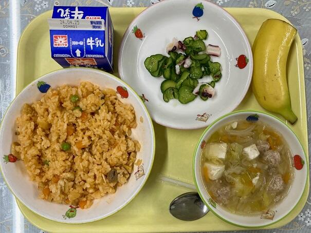 チキンピラフ、肉団子スープ、たこきゅうり、バナナ、牛乳