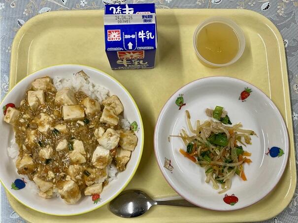 ごはん、麻婆豆腐、ナムル、リンゴゼリー、牛乳