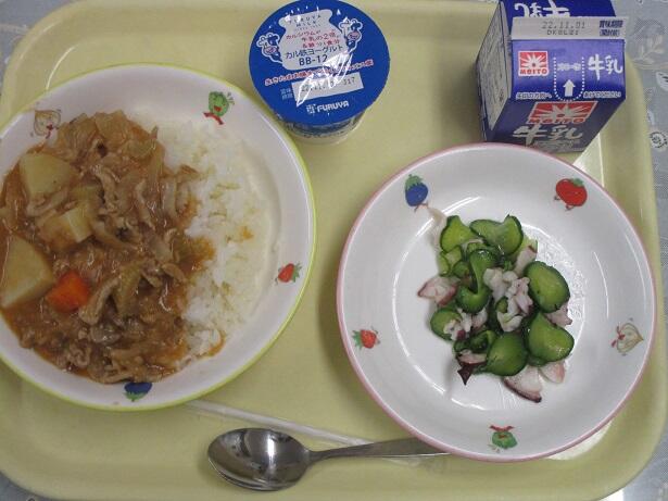 就学時健康診断を控える今日は特別時程なので、11時10分過ぎに検食が運ばれてきました。デミグラスソースの濃い色ではなく、肉じゃが色のハヤシライスはまろやかです。たこキュウリは、生臭さが全然なくてとても良い味!