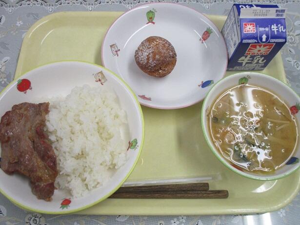 ごはん、豚肉の生姜焼き、味噌汁、かぼちゃドーナツ、牛乳