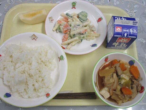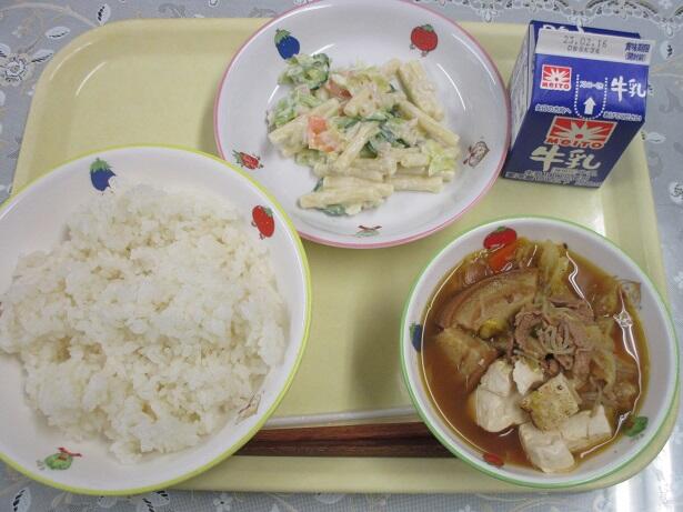 ごはん、すき焼き煮、マカロニサラダ、牛乳