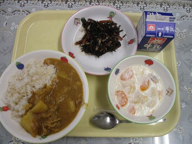 ポークカレー、ひじきのマリネ、ぶどう、牛乳