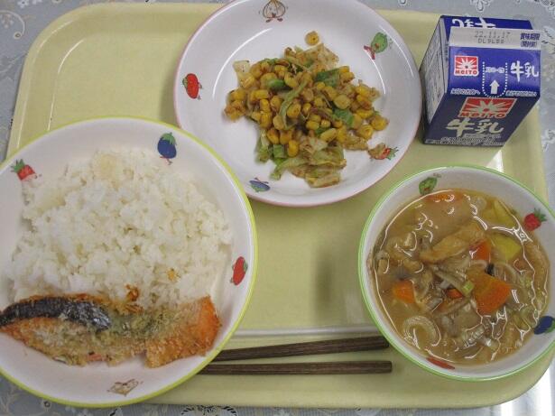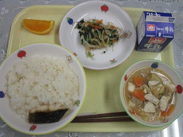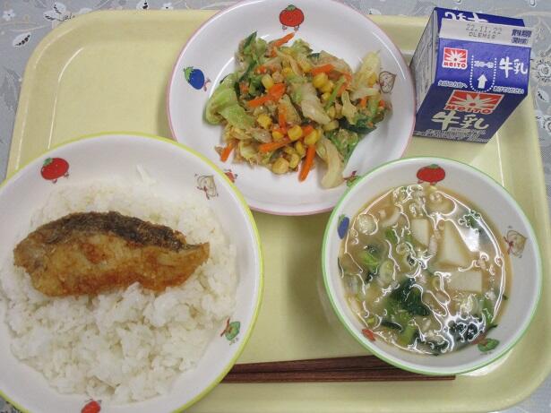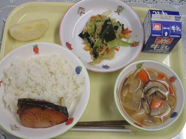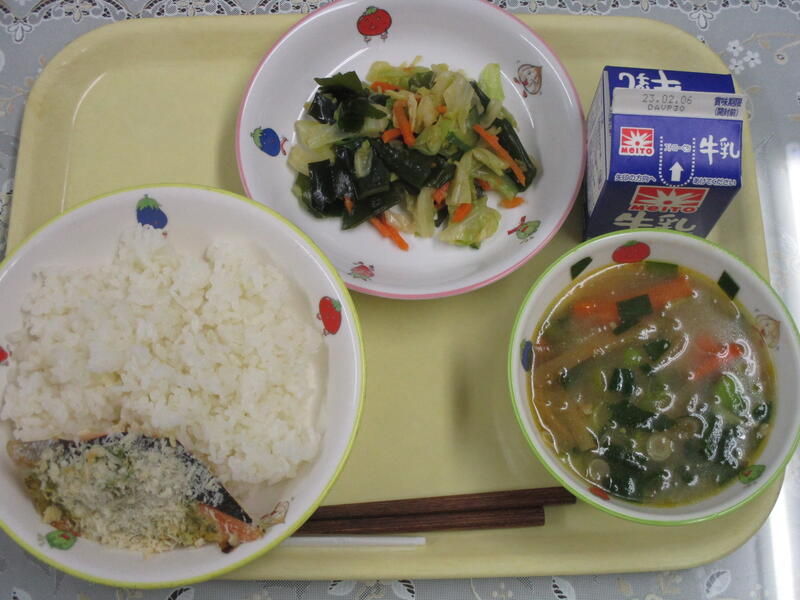 ごはん、鮭のパン粉焼き、どさんこ汁、わかめサラダ、牛乳