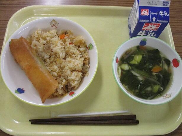 今日のメニューは6年1組で考えた「元気いっぱいメニュー」です。家庭科で学んだあとに栄養のバランスを考えて献立作りをします。そこから生まれたのが今日のメニュー。写真では、唐揚げがチャーハンと同化して見えますが、ともにおいしい。酢の物はキュウリを酢で揉んだ感じ。ピンク色のものはそうめんかと思いきやかまぼこを割いたものでした。2組のメニューは2月に登場します。期待が膨らみます。