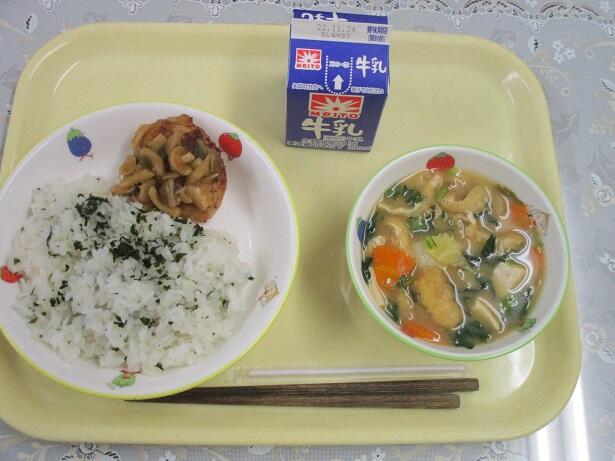 ごはん、ハスの和風ハンバーグ、市川海苔の味噌汁、ごま和え、牛乳