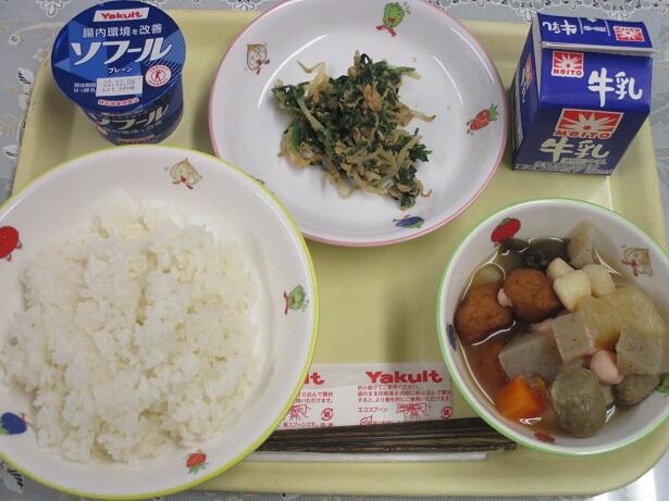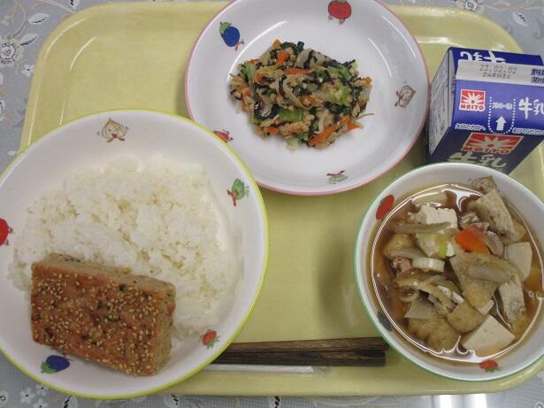 ごはん、擬製豆腐、せんべい汁、小松菜のごま和え、牛乳